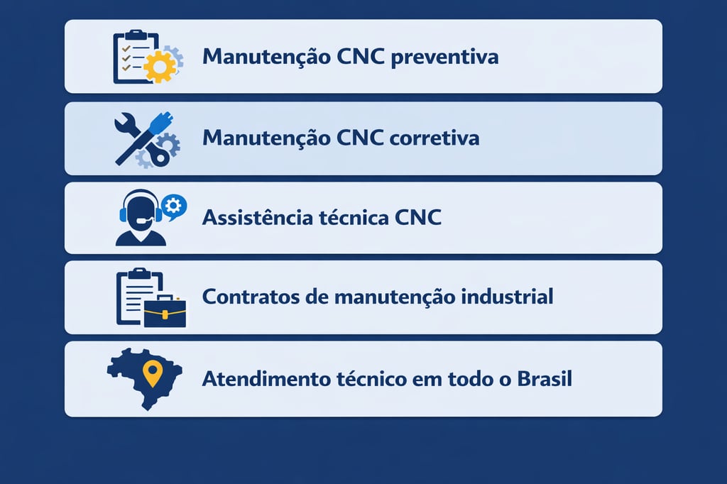 Atuamos com manutenção preventiva, corretiva e assistência técnica CNC, reduzindo paradas inesperadas e aumentando a vida útil dos equipamentos.